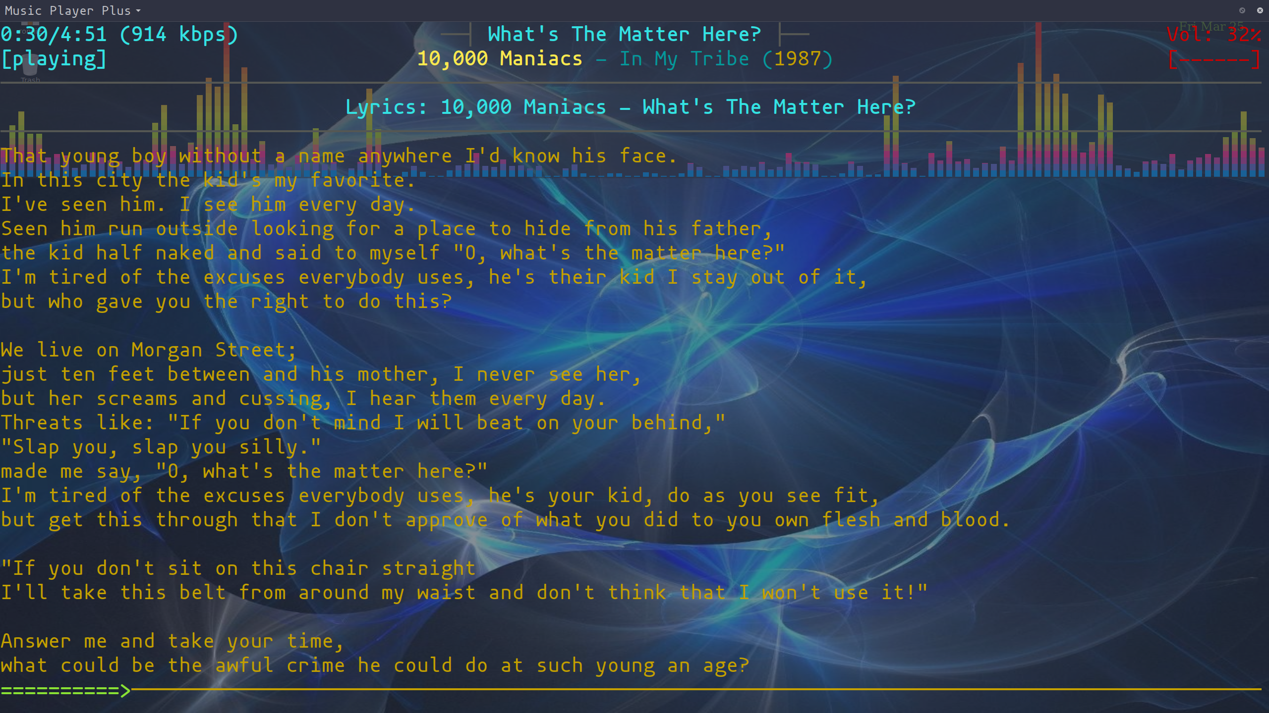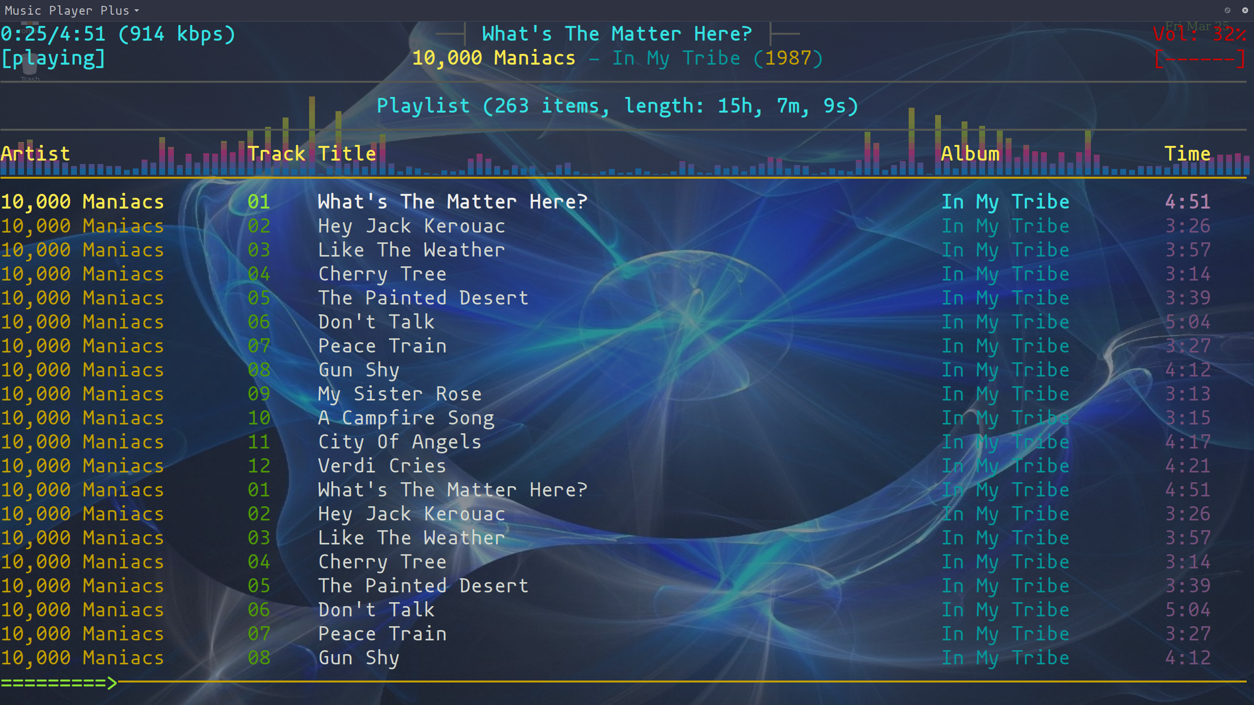 [Note:] Typical use of mpplus as a music player and spectrum visualizer will invoke a tmux session to display the MPD client, spectrum visualizer, and album cover art all in a single terminal window. MusicPlayerPlus configures tmux with a custom key binding to exit tmux sessions. To exit an mpplus tmux session, the Alt-x key binding can be used.