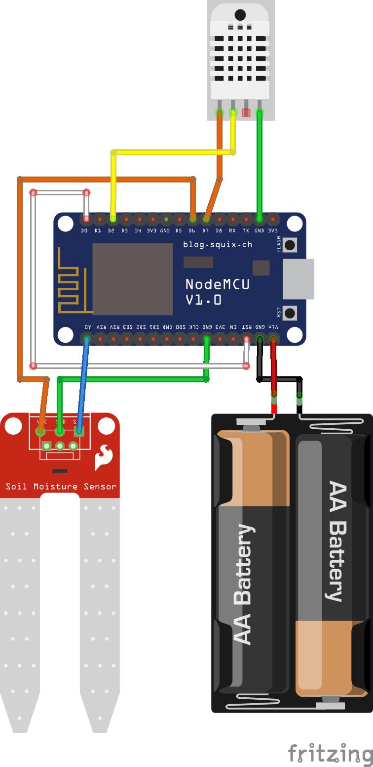 The hardware setup consists of a ESP8266 Microcontroller with a powersupply and two connected sensors.