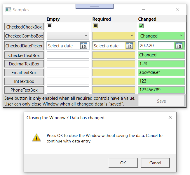 A warning message shows him which data has changed and asks if he really wants to lose that change by closing or save it by clicking the Save button. This warning message can be surpressed by setting CheckedWindow.IsNoCheckOnCLosing = true.