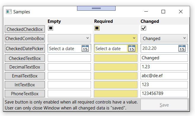 The Save button gets only enabled once the user has entered some data for all required controls. If he tries to close the window before doing so, a warning message gets displayed. If everything is saved, but 1 control gets changed again, the same thing happens. The user needs to save before he can close the window.